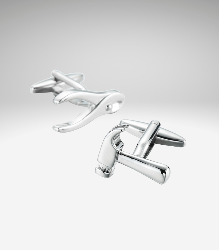 Sølvfarvede manchetknapper med henholdsvis hammer og tang