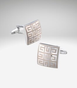 Manchetknapper med et mønster sølv på en “børstet” baggrund.
