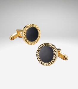 Kombiner klassisk elegance med et moderne twist med disse manchetknapper, der fremviser en sort indlægning omkranset af et guldgræsk mønster.
