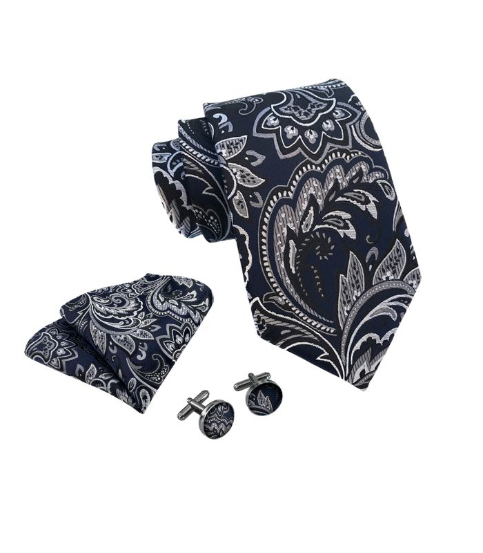 Slipsesættet består af slips, matchende manchetknapper og lommeklud