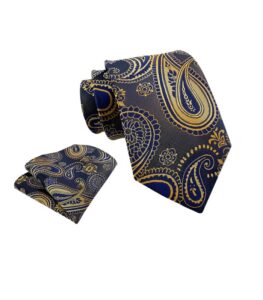 Dette navyblå slips er prydet med et elegant gyldent paisley-mønster, der udstråler sofistikation og klasse. Perfekt til forretningsmøder og specielle anledninger.