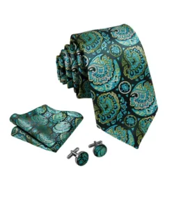 Slipsesættet består af slips, matchende manchetknapper og lommeklud