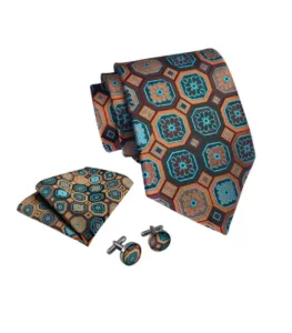 Lys dit outfit op med dette livlige turkise og orange slips med et iøjnefaldende geometrisk mønster og et matchende lommetørklæde.
