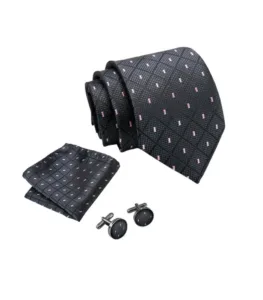 Slipsesættet består af slips, matchende manchetknapper og lommeklud
